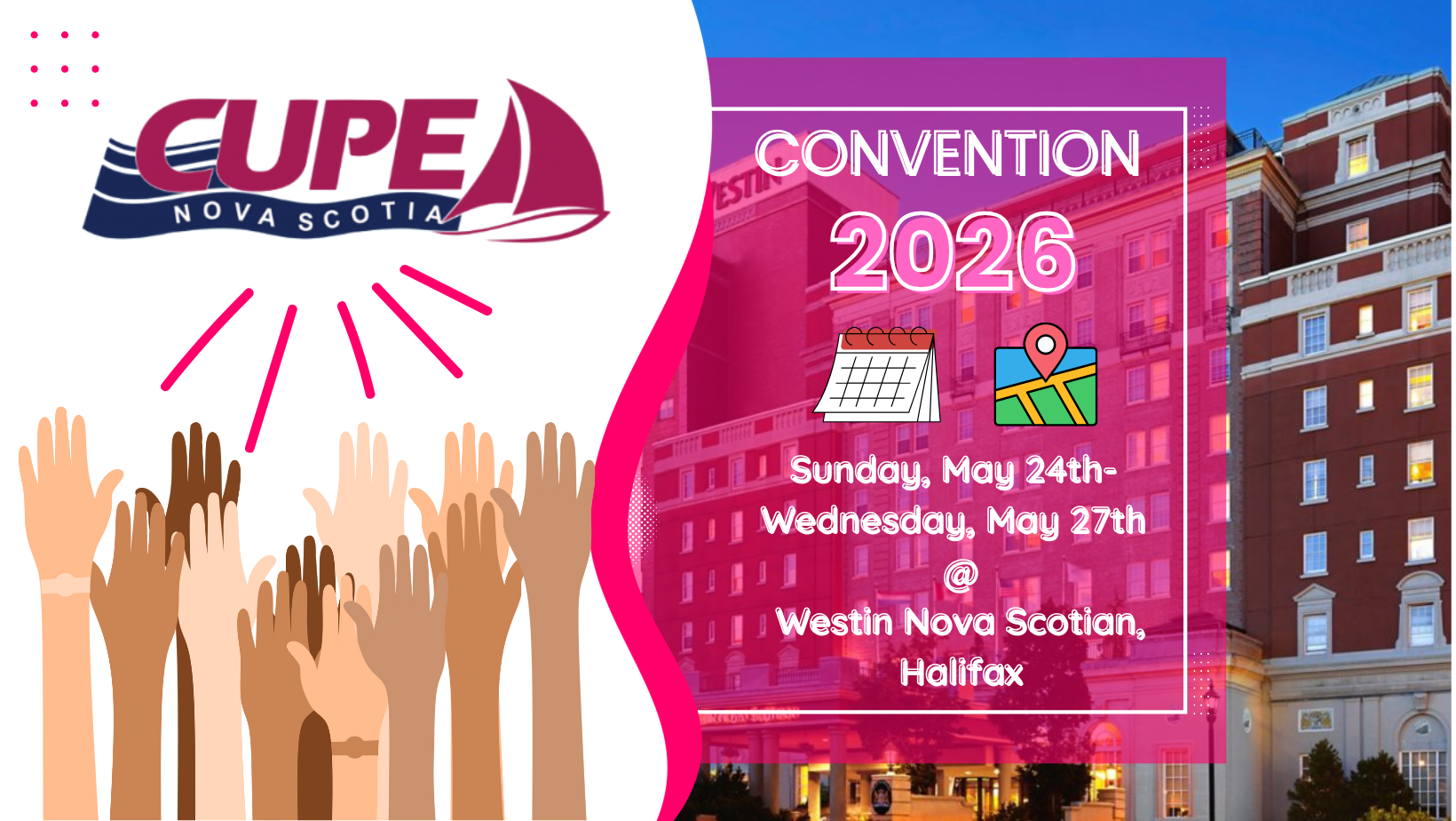 Save the dates! CUPE Nova Scotia’s 2026 Convention will be held from May 24th-27th at the Westin Nova Scotian in Halifax. Please see the attached convention call below. The online registration form (which MUST be filled out completely and properly) can be found here. NOTE: Registration is not complete until fees have been paid. If a delegate wishes to participate in the Diversity Caucus and/or the Young Worker Caucus they must self-identify during registration. To vote in your Area Caucus you must specify which Area you work in during registration. Details about these caucuses can be found in Article 5.07 of the CUPE Nova Scotia Constitution. At past Conventions, Locals have been very kind in donating swag such as pens, pins, notepads, water bottles, etc. Please let Vice-President Nelson Scott (vicepresident@cupens.ca) know if your Local would like to do so again! We encourage as many Locals as possible to submit … Read more…